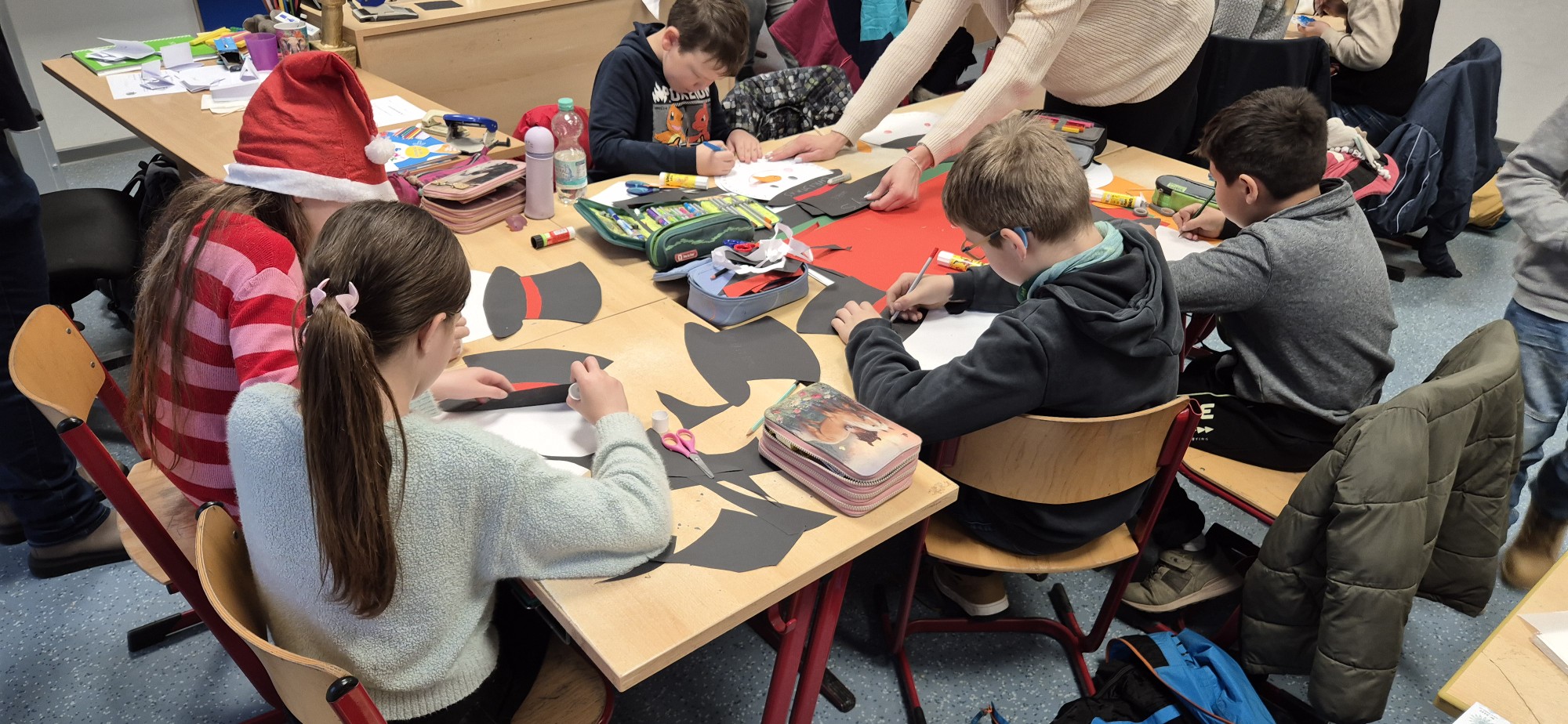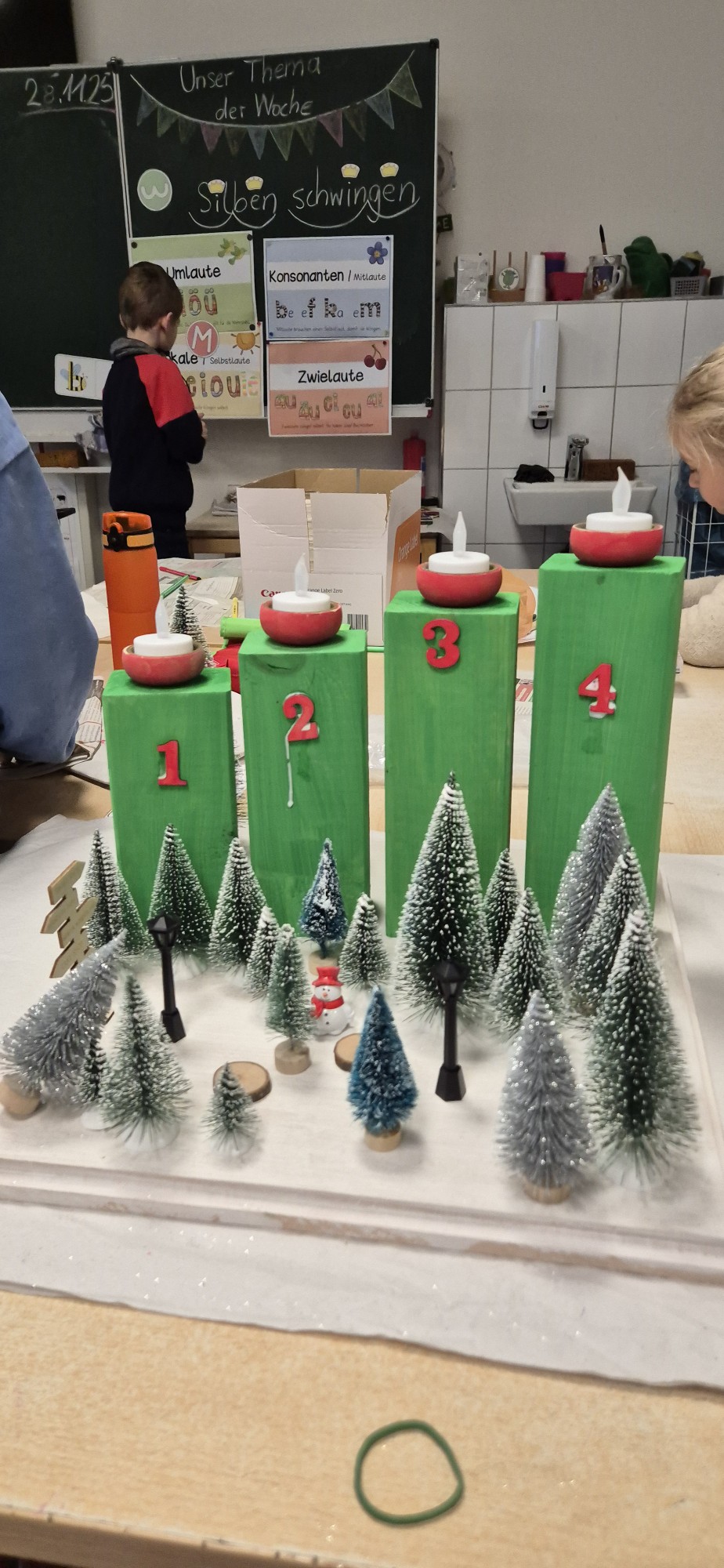 Es ist schon langsam zur Tradition geworden, dass wir immer am Freitag vor dem ersten Advent unsere Schule adventlich schmücken. Dazu basteln die Kinder mit den Lehrkräften und einigen Eltern verschiedene, weihnachtliche Dekorationsgegenstände. Auf den Fluren roch es nach Tannengrün und Gebäck. Die bunten Basteleien schmücken nicht nur die Klassen sondern auch die Aula. Dort steht der große Weihnachtsbaum, der mit der Lichterkette und den Arbeiten der Kinder eine festliche Weihnachtsstimmung verbreitet. Mit einem gemeinsamen Adventssingen am Montag nach den Adventssonntagen, Besuchen von Weihnachtstheatern oder Weihnachtsfeiern in den Klassen geht es mit großen Schritten Richtung Weihnachten.